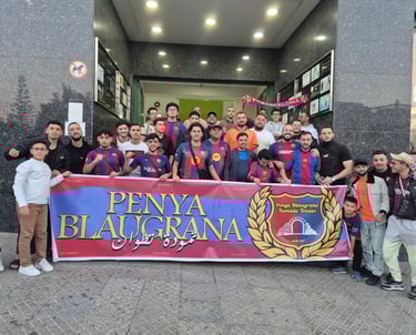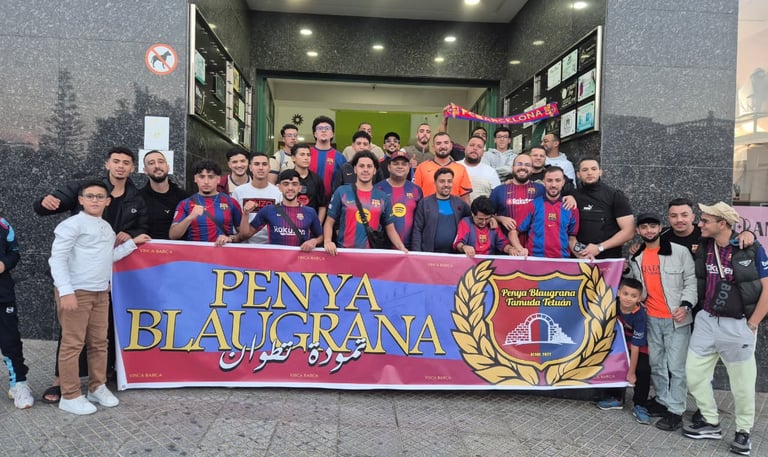Acceso al encuentro social de la penya con actividades culturales y ambiente blaugrana en Tetúan.